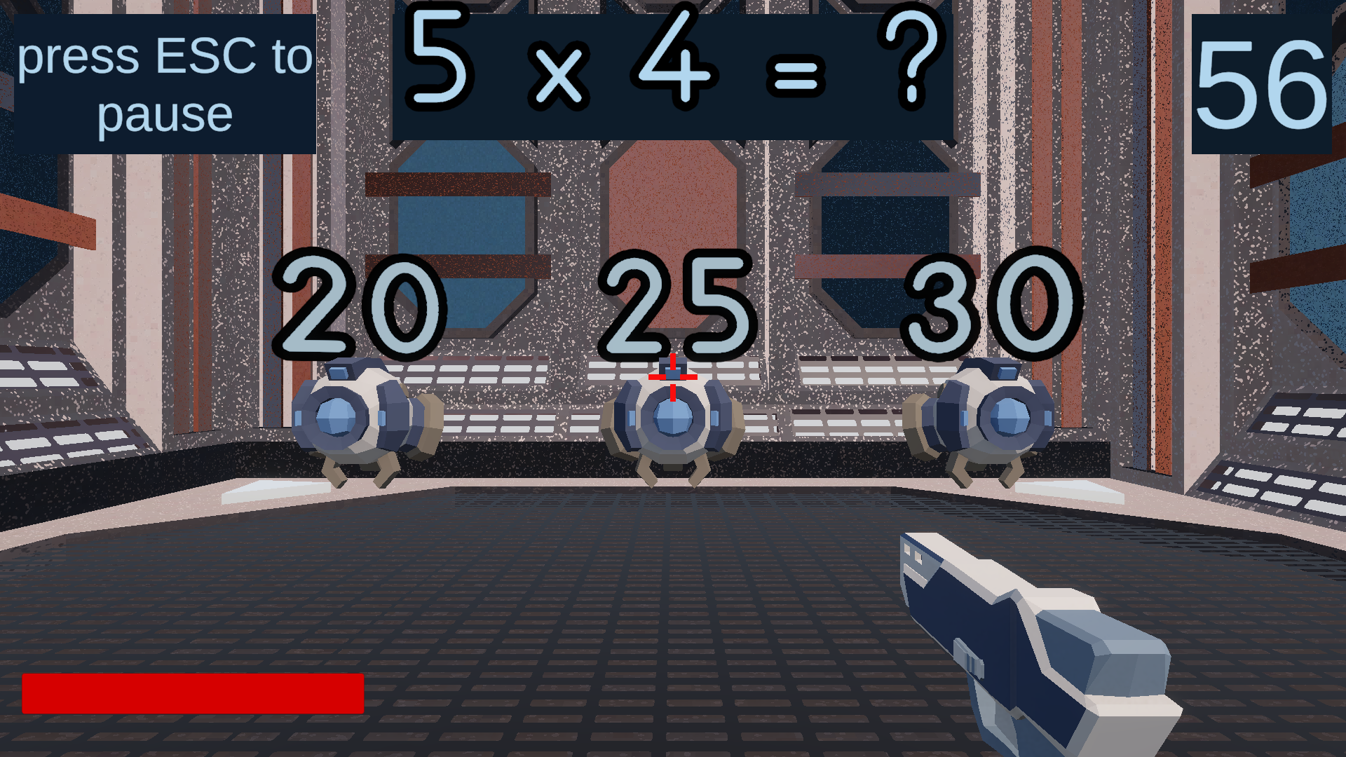 Destroy the robots using your knowledge of the multiplication table and earn stickers. A multiplication question will appear at the top of the screen. The answer choices will teleport along with the robots above their heads. Find the correct answer and shoot the robot that has the correct option beneath it. Aim by moving the mouse. Click the left mouse button to shoot. Press the ESC key to pause the game.